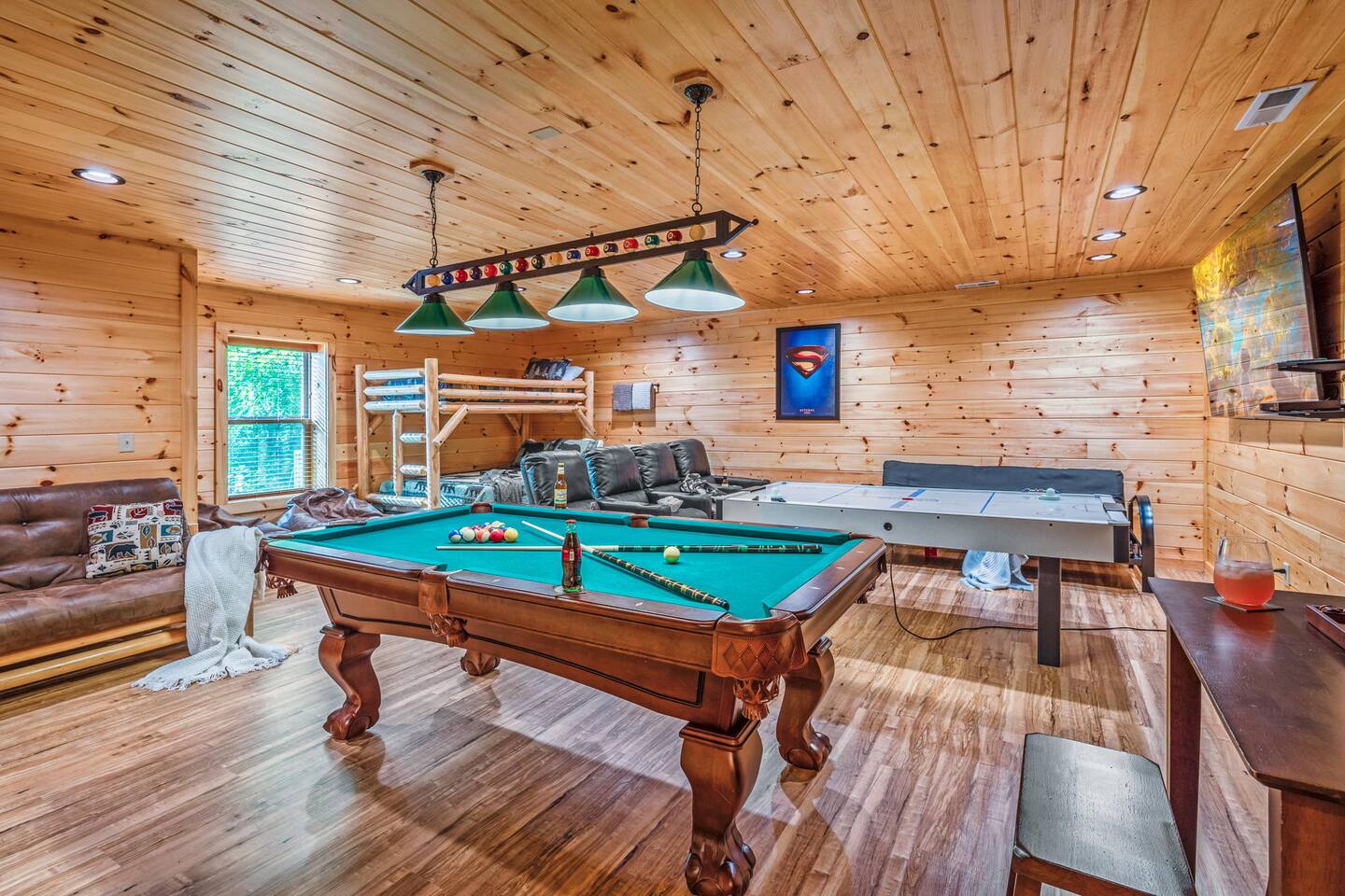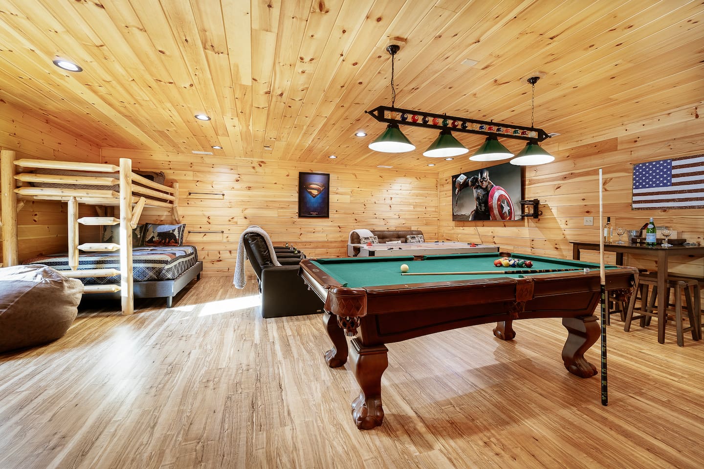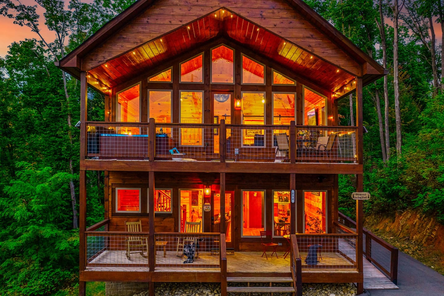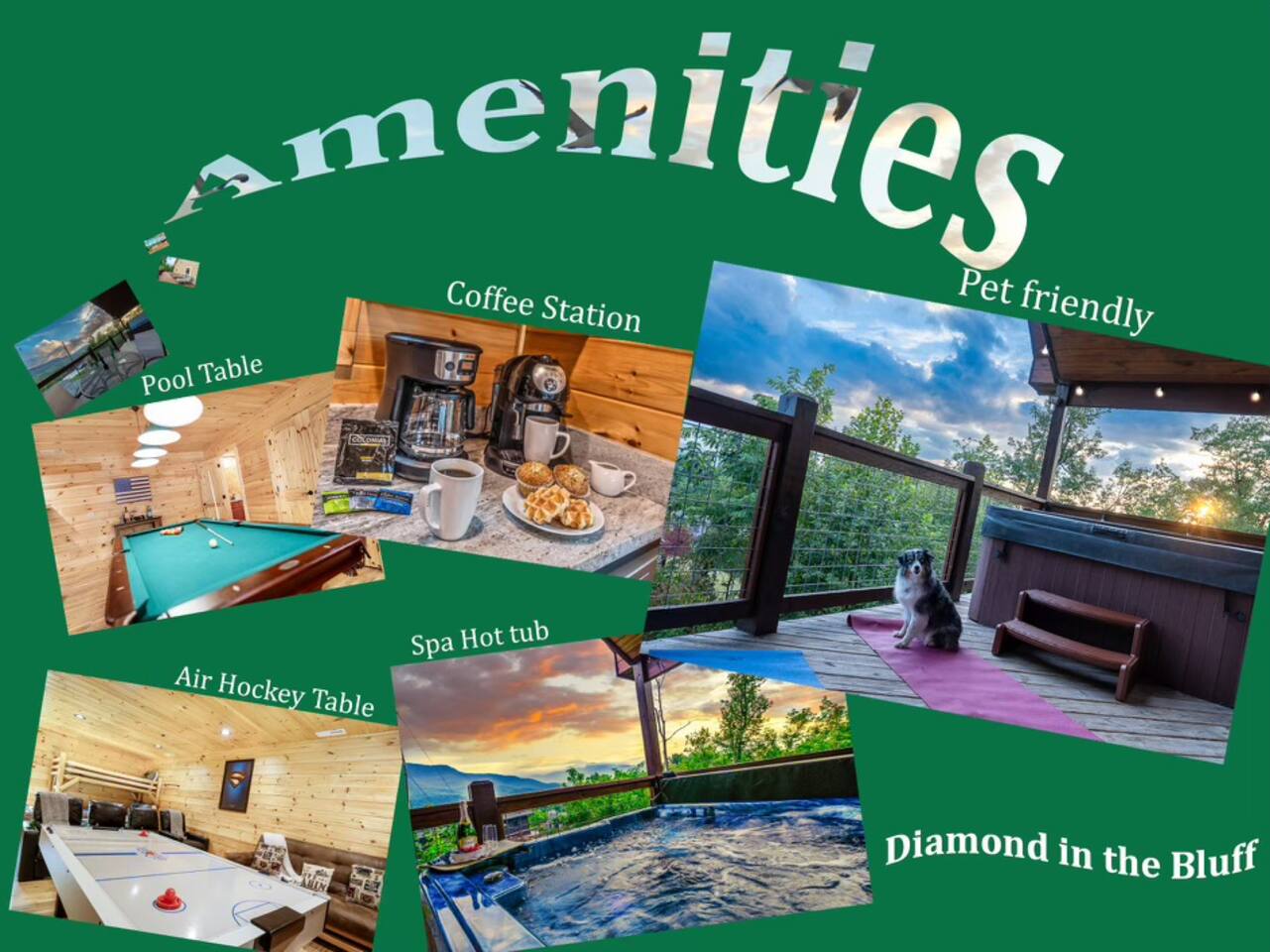 Elevate your Smokies getaway with family, friends & Fido @ Diamond In The Bluff-Gatlinburg. ⁜ 10 Human Max ⁜ Parking for 3 cars Max ⁜ 600+ Mbps WI-FI ⁜ Fully Equipped Kitchen with granite countertops and all stainless steel appliances ⁜ Electric Fireplace ⁜ Gas BBQ-Weber Grill ⁜ Game room-fully equipped with theater chairs, pool table, air-hockey table, backgammon set and much more ⁜ Hot tub for 6 people ⁜ Ramp on the side of the cabin and accessible entire main floor of the cabin